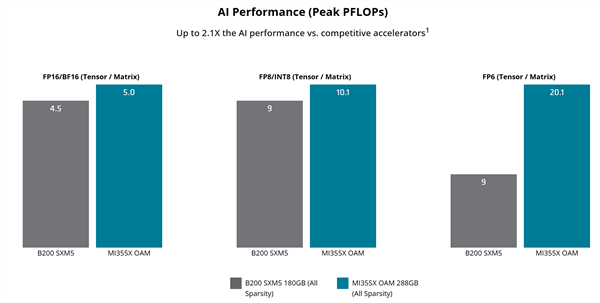 MI355X的FP64机能可达78。6TFLOPS,FP16、FP8及FP4机能则是5、10。1、20。1PFLOPS。