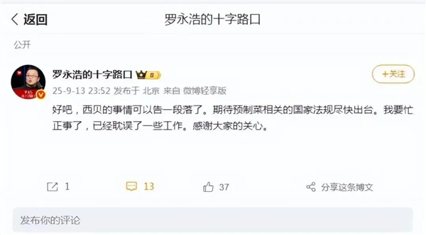 罗永浩还正在微博分享了对预制菜和消费者知情权的文章,文章题目为《不怕你预制,怕你不告诉我》。