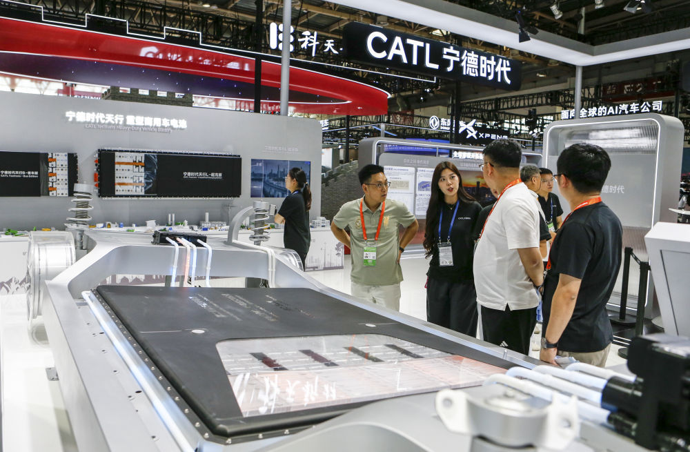 2025年7月16日,参会者正在举行的第三届中国国际供应链推进博览会智能汽车链展区领会宁德时代神行PLUS电池。记者 丁 摄。