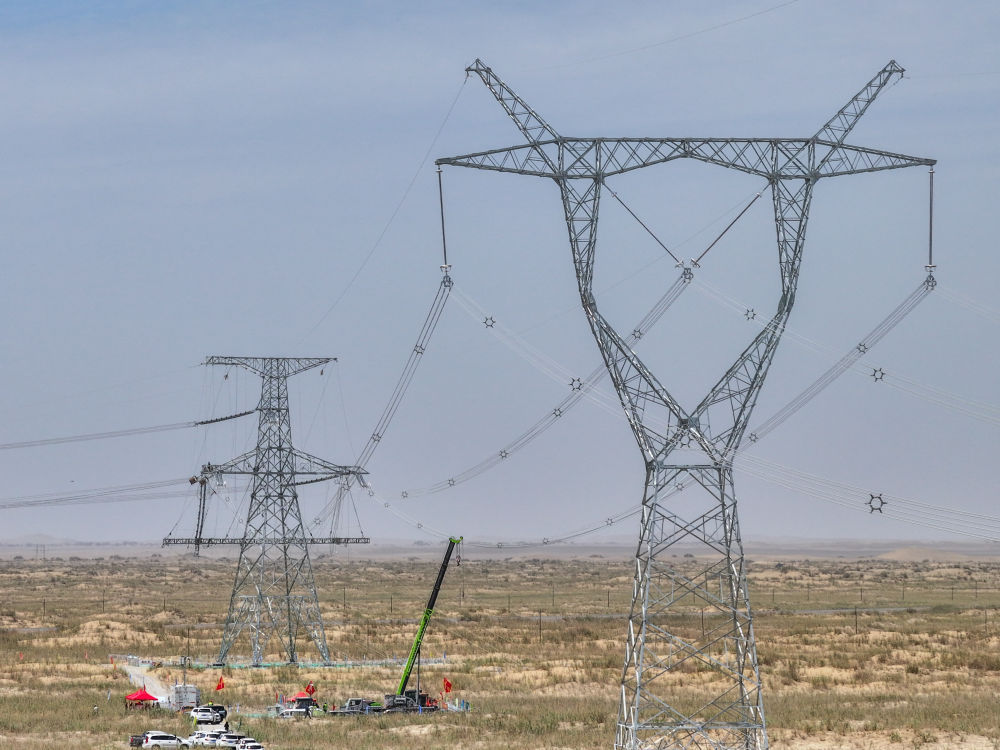 2025年7月13日,正在塔里木盆地南缘的新疆和地步区平易近丰县,跟着牵引机将最初一段电线千伏输变电工程全线贯通(无人机照片)。记者 丁磊 摄。